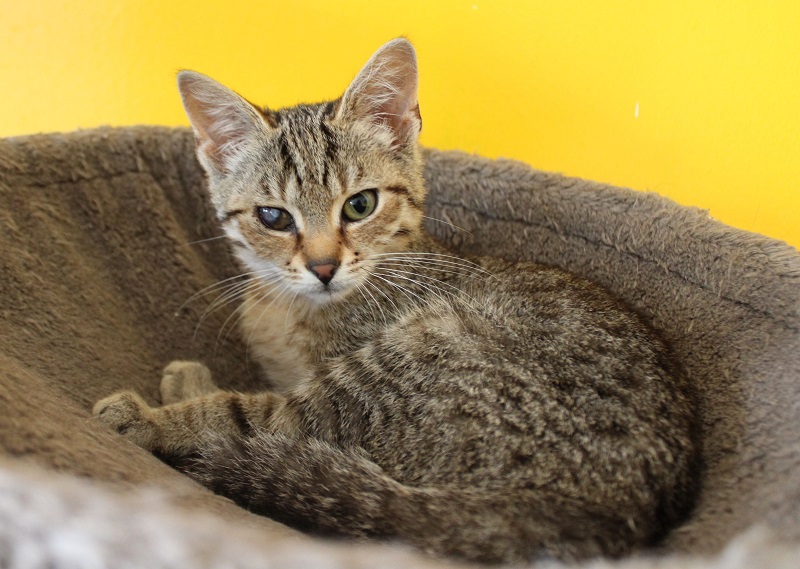 Mazlivý a přátelský kocourek nalezený jednou z našich bývalých pomocnic u nich v obci za Prahou. Kocourek měl nemocné očko a kožíšek plný strupů – ukázalo se, že šlo jen o alergii na bleší kousnutí, tudíž snadné řešení. Horší to je s jeho očkem, zůstal mu zhojený vřed. Jemu to však nevadí a hraje si a lumpačí jako správné kotě.